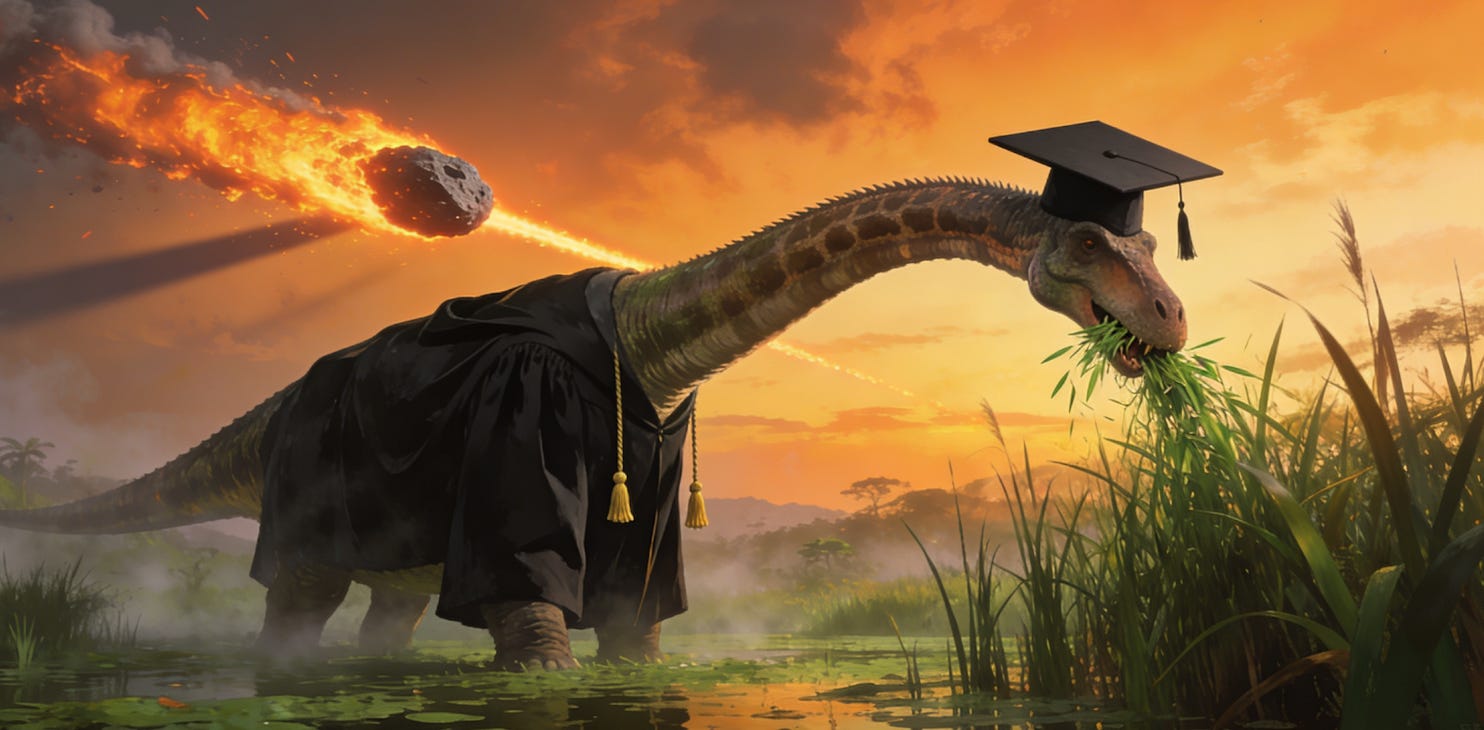 The problem isn’t that AI is going to plunder people’s livelihoods. The problem is that the entire machinery of higher education, which is designed to prepare people for those livelihoods, has become its own kind of dinosaur, and AI is the asteroid that’s about to strike and ensure its speedy extinction.